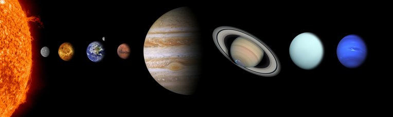 Ons zonnestelsel met de relatieve groottes van de planeten: Mercurius, Venus, Aarde, Mars, Jupiter, Saturnus, Uranus en Neptunus. Pluto wordt niet (meer) als een planeet gezien - hij draait in een meer elliptische en bovendien scheve baan om de zon.